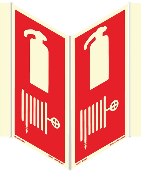 Etterlysende plogskilt med bilde av brannslange og brannslukker. Plogskiltet blir ladet opp av normaltbelysning, og vil lyse i mørke dersom lyset blir slått av eller strømmen går.