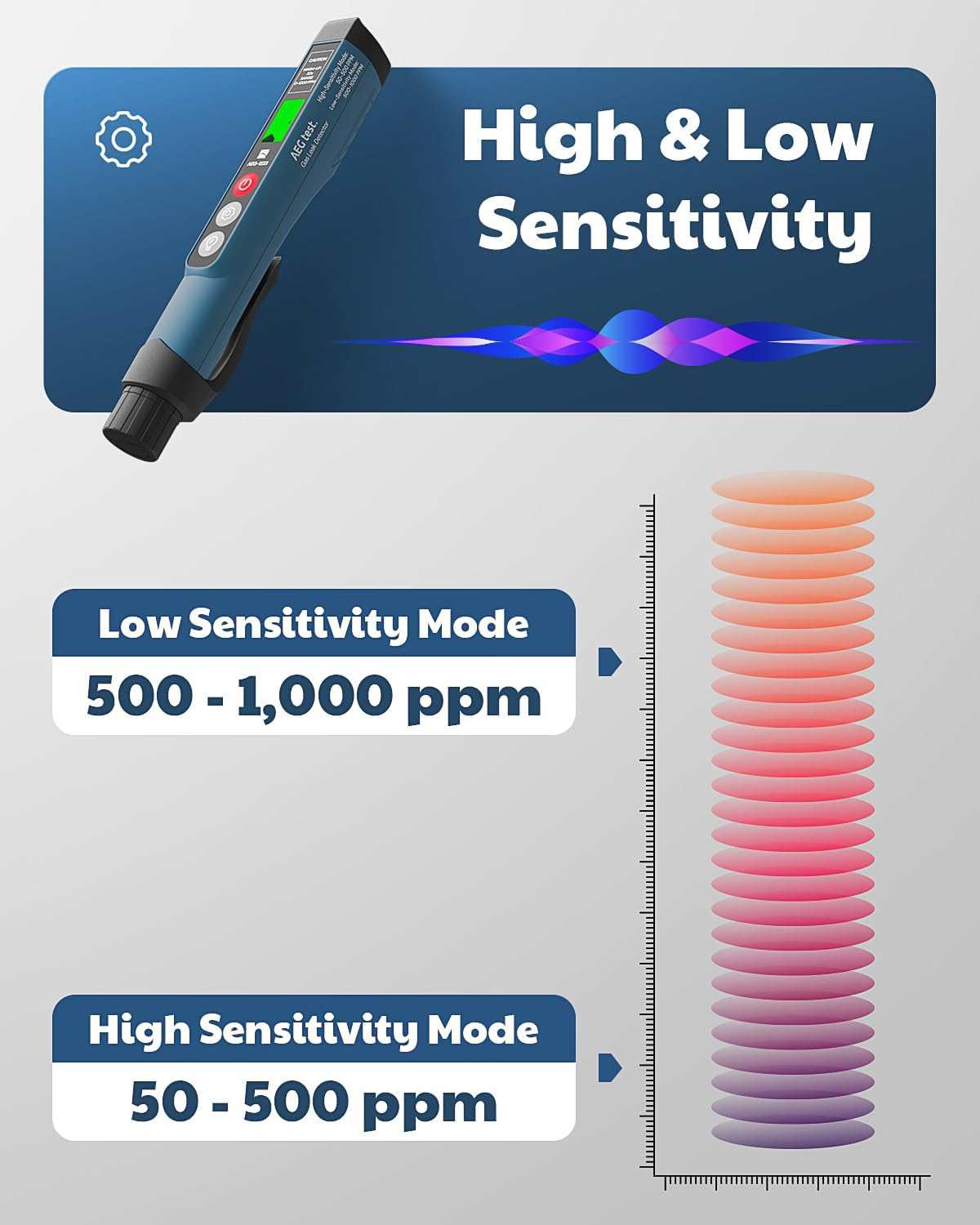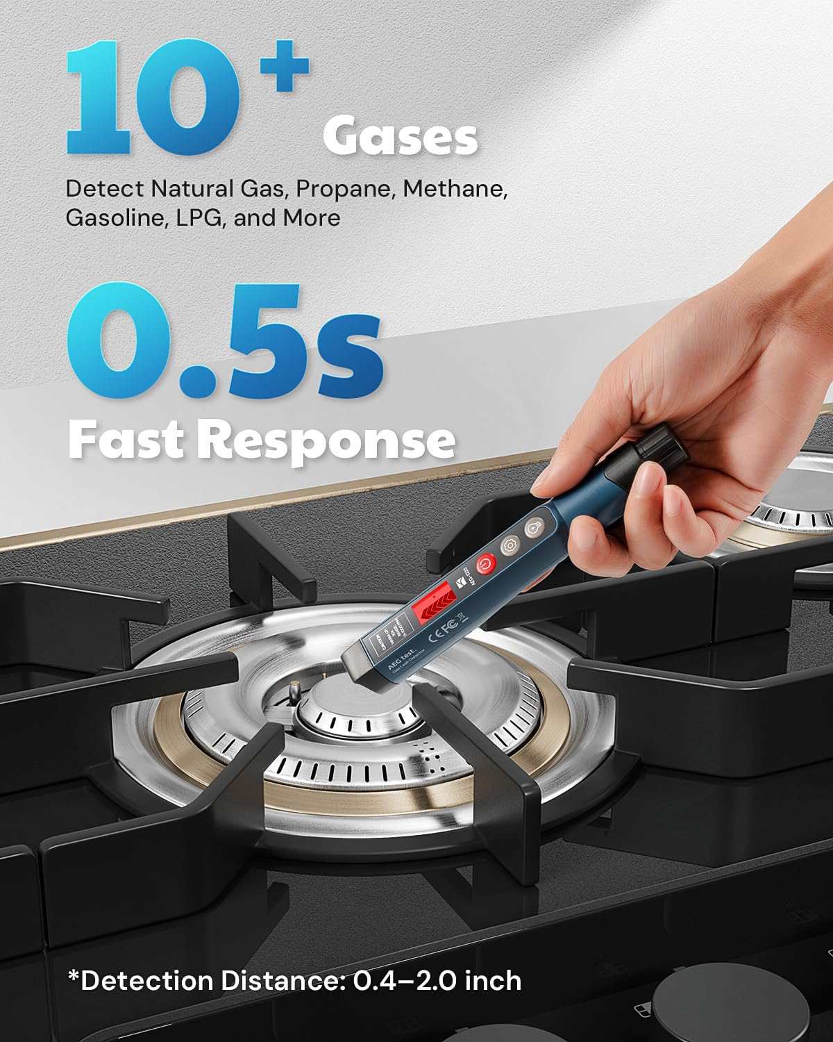 Denne gasslekkasjedetektoren har to følsomhetsnivåer (høy og lav) og oppdager brennbare gasser som naturgass og propangass på kun 0,5 sekunder. Måleområdet på 0–1000 ppm gjør det enkelt å finne både små og større lekkasjer.