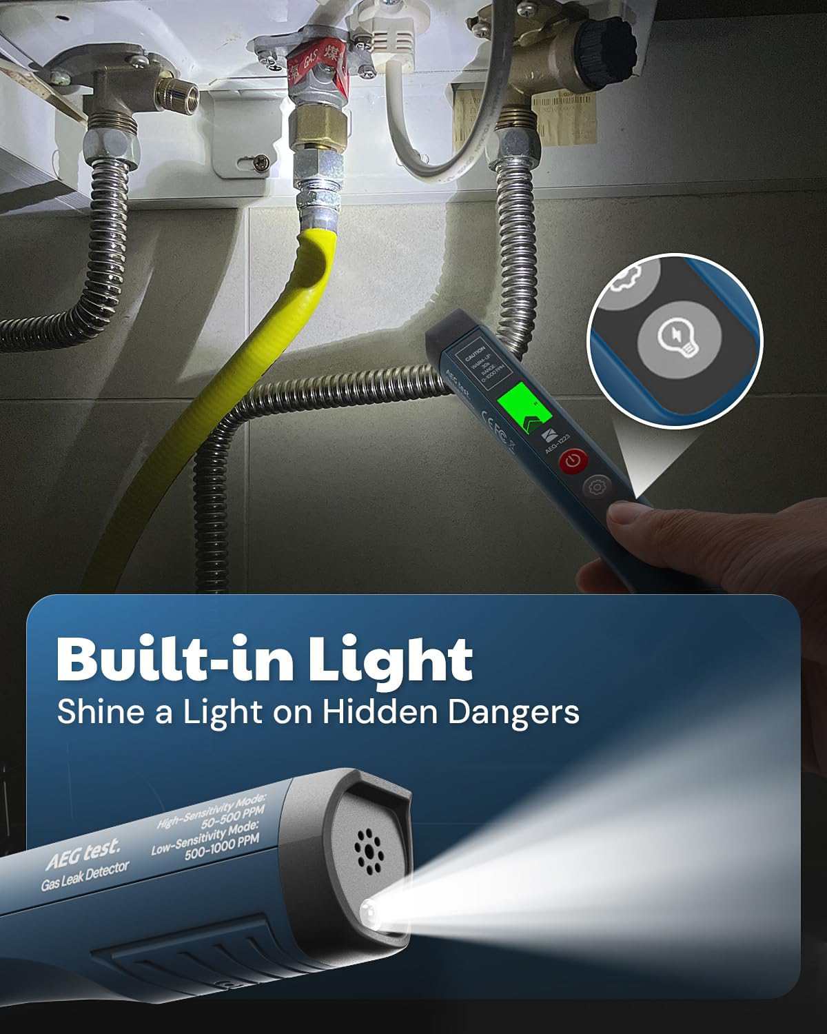 Den integrerte LED-lampen gjør det enkelt å lokalisere gasslekkasjer bak skap, i tekniske rom eller andre steder med dårlig belysning.