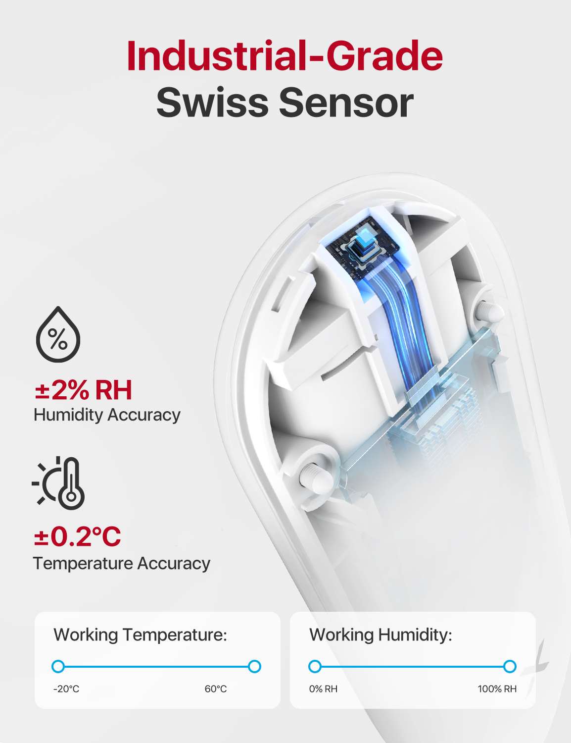 Den sveitsiskproduserte høypresisjonssensoren gir svært nøyaktige målinger med temperaturavvik på kun ±0,2°C i området –20 til 60°C, og fuktighetsnøyaktighet innen ±2 % RH.