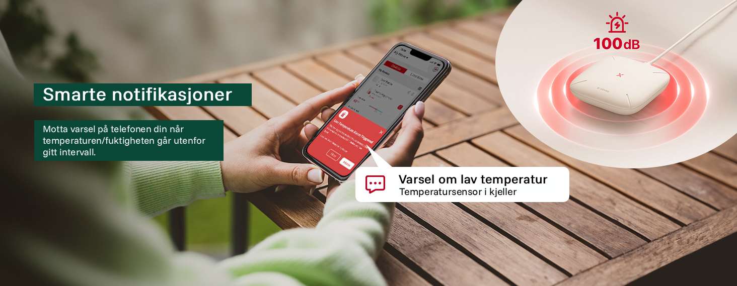 Sett opp temperaturintervaller du ønsker å få beskjed om – og appen varsler deg med push varslinger når temperaturen går utenfor intervallet.