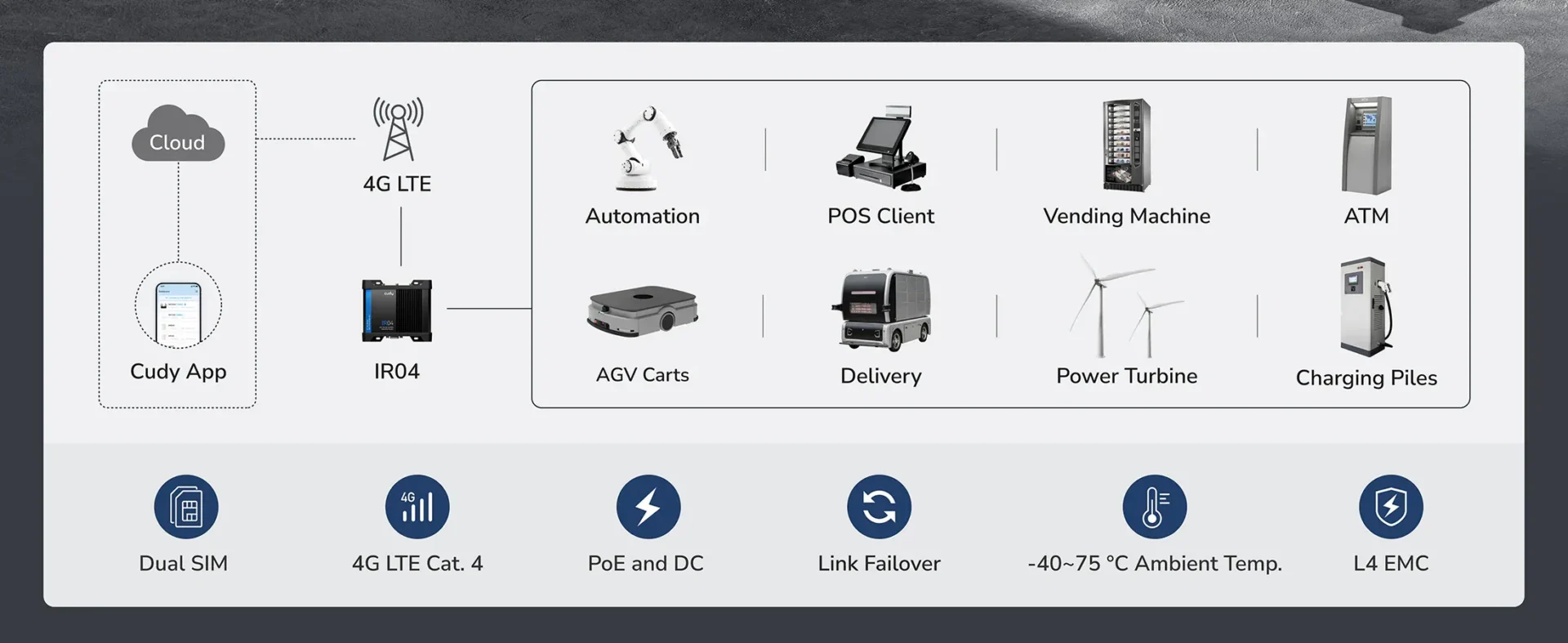 Cudy IR04 er en industriell 4G ruter designet for situasjoner der vanlig bredbånd eller fiber er utilgjengelig: Perfekt for kjøretøy, industribygg, maritime installasjoner, olje & gass-anlegg, gruvedrift og andre krevende miljøer.