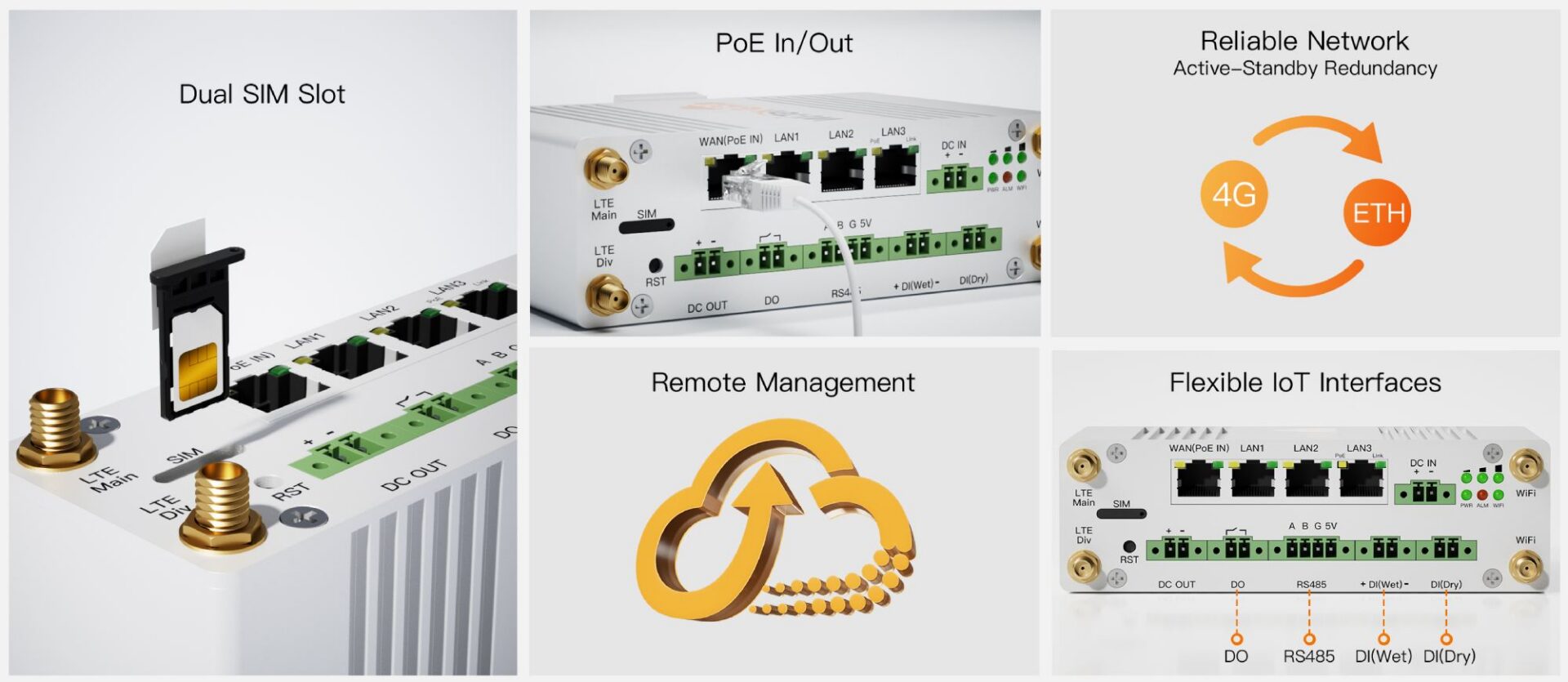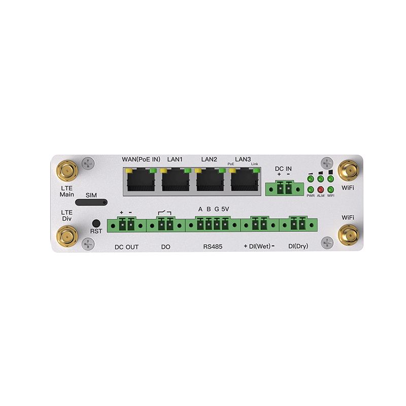 PoE-utgang (IEEE 802.3af/at): Driver overvåkningskameraer eller aksesspunkter direkte fra gatewayen – overfører data og strøm i samme kabel.
