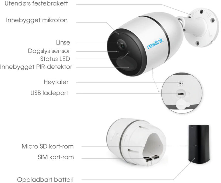 I utgangspunktet er dette et batteridrevet utendørs 4G kamera, dvs. det har et oppladbart batteri som kan lades med medfølgende USB mikro kabel – eller et Reolink solcellepanel. Ettersom batteriet er oppladbart tåler det ikke å stå tilkoblet med strøm til enhver tid. Ønsker du å koble kameraet til fast strøm må du derfor ta batteriet ut av kameraet.