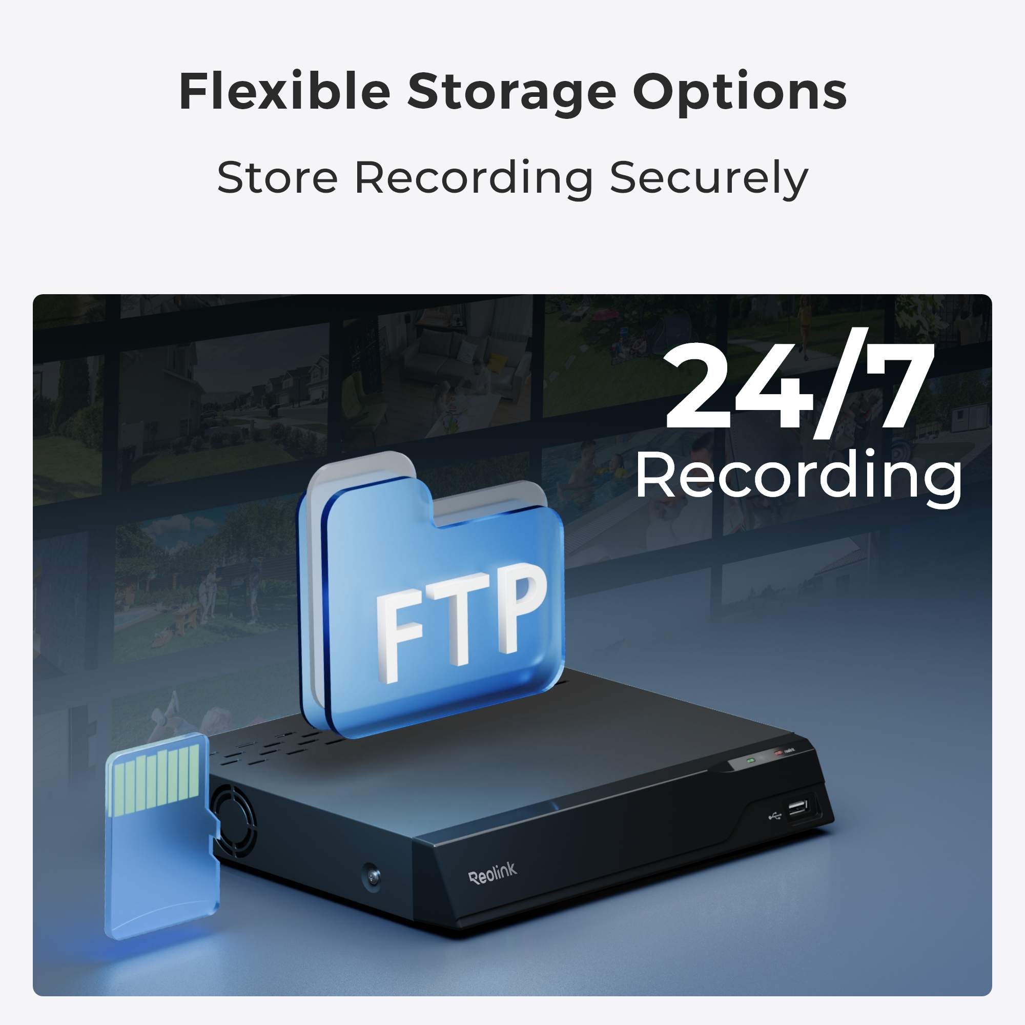 Pålitelige lagringsalternativer, inkludert microSD-kort, Reolink PRO NVR med høy kapasitet eller kryptert FTP-lagring.