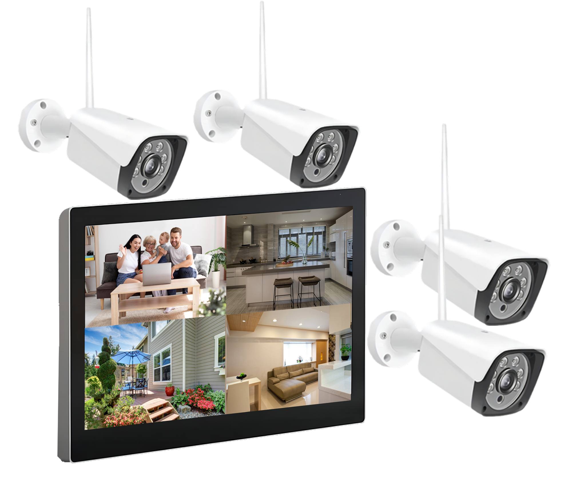 Komplett trådløst overvåkningskamera pakke med touch-skjerm og 4 kameraer. Perfekt for enkel og trådløs kameraovervåkning i mindre butikker, bedriftslokaler eller hjemme i din egen bolig.