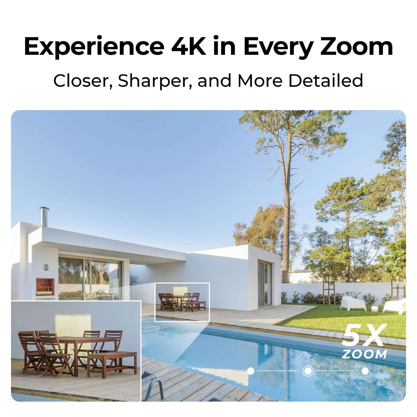 Ultra-HD 4K PTZ-kamera med 360° dekning, 5× optisk zoom, Wi-Fi 6 og Auto Tracking – komplett sikkerhet hjemme og ute.