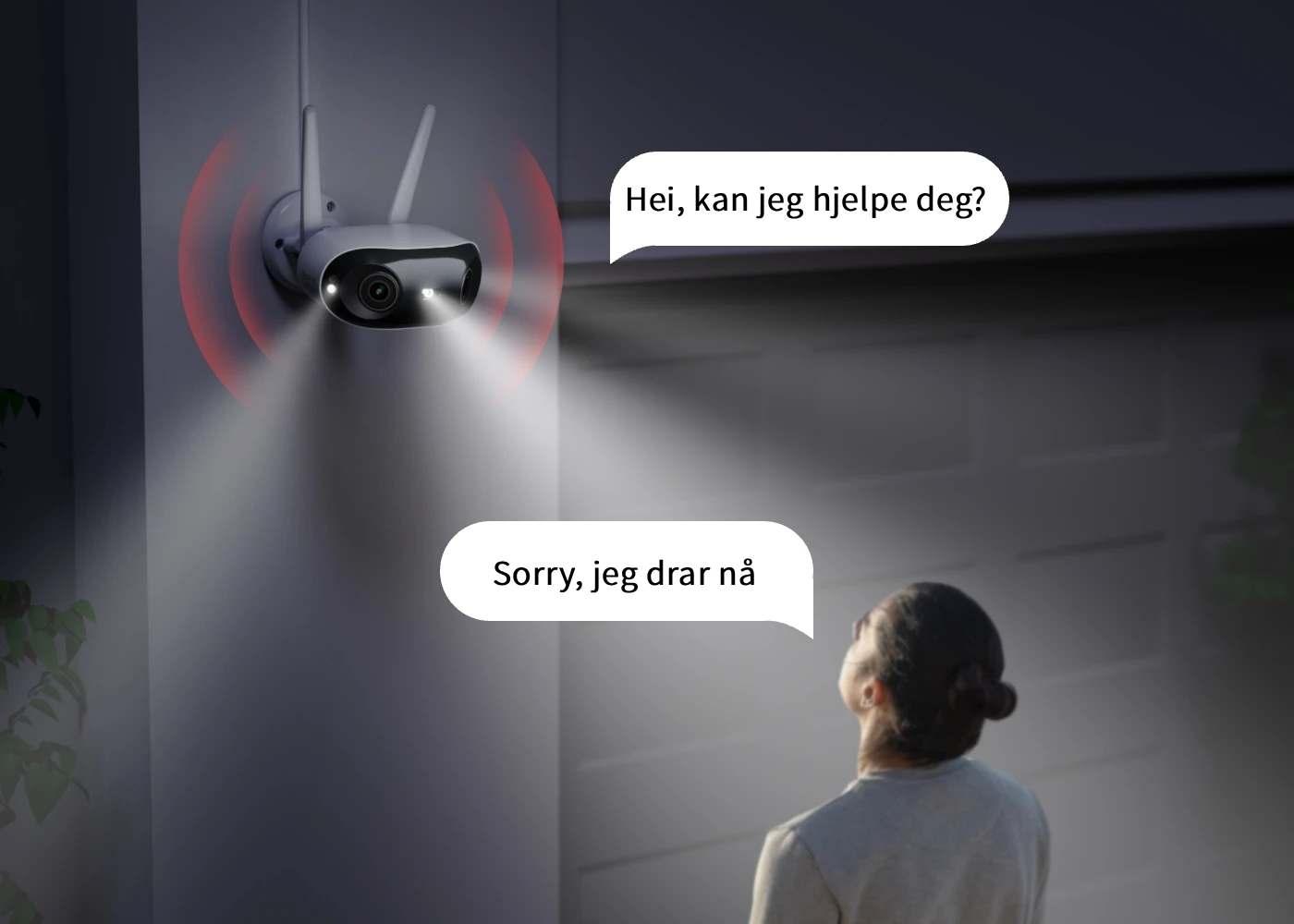Når mistenkelig aktivitet oppdages, kan Spotlysene og den høye sirenen aktiveres for å skremme bort uvedkommende – samtidig som du får varsel i sanntid. Og skulle du trenge å gripe inn, lar den innebygde to-veis lyden deg snakke direkte med besøkende uansett hvor du er.