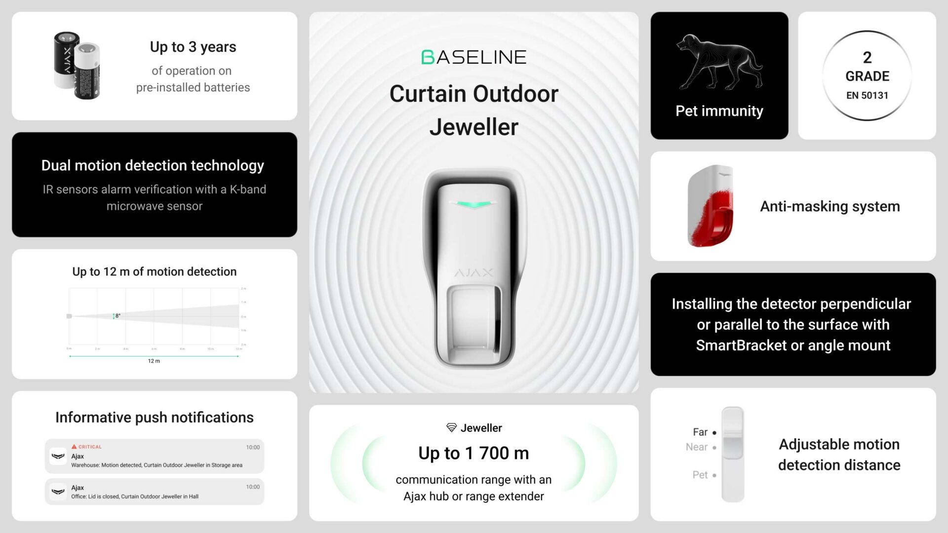 Takket være justerbar rekkevidde, følsomhet og to intuitive driftsmoduser, tilpasses Curtain Outdoor Jeweller enkelt enhver installasjon. De forhåndsmonterte batteriene gir opptil 3 års driftstid, slik at du får en driftssikker løsning uten behov for hyppig vedlikehold.